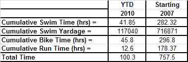 Below are the totals since 2007 and the average per month since then. These totals include all races. I think 21+hours of training a month for over 3 years is a pretty good average.